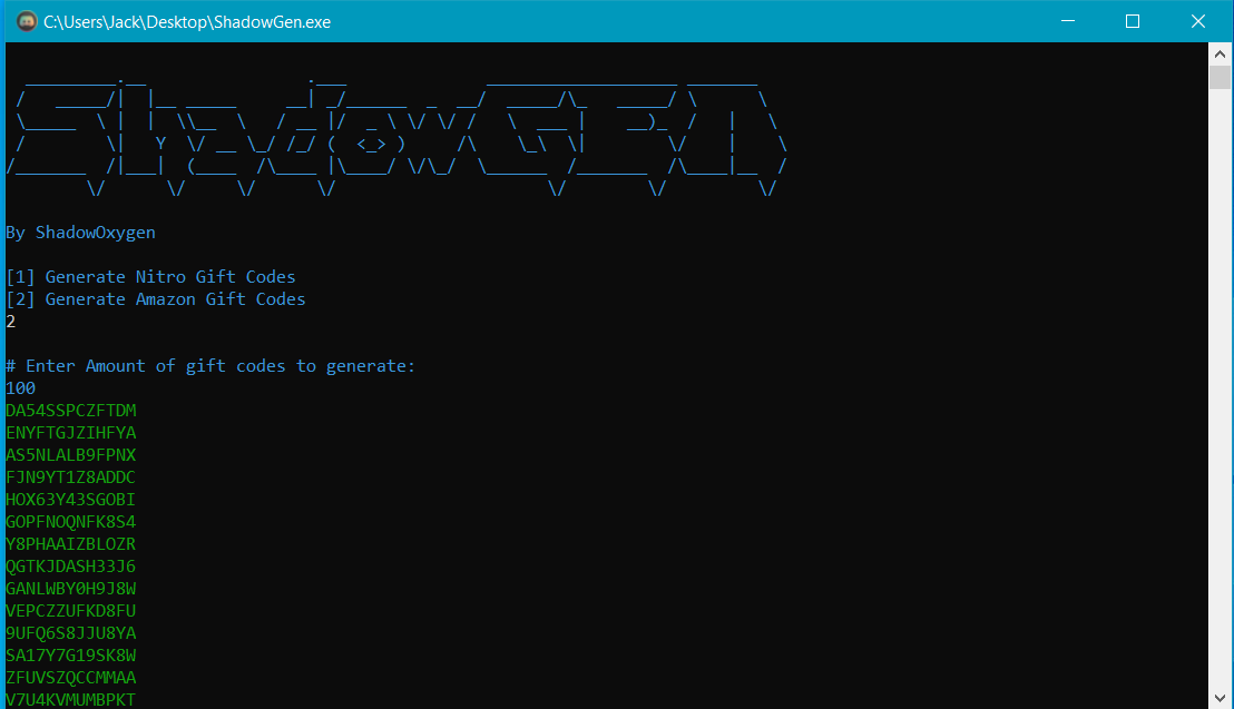 Amazon & discord nitro gift card generator is another tool of ShadowOxygen. ShadowGen contains two modules one for discord and second for amazon. This tool was written in python, but he created a .exe file after that. These codes will not work until you check them with a working checker that will filter out working codes. Please don’t verify each code manually by yourself; it will take a lot of time, and there is no chance you will find a working code using this method. If I find any checker related this, I’ll upload it here.