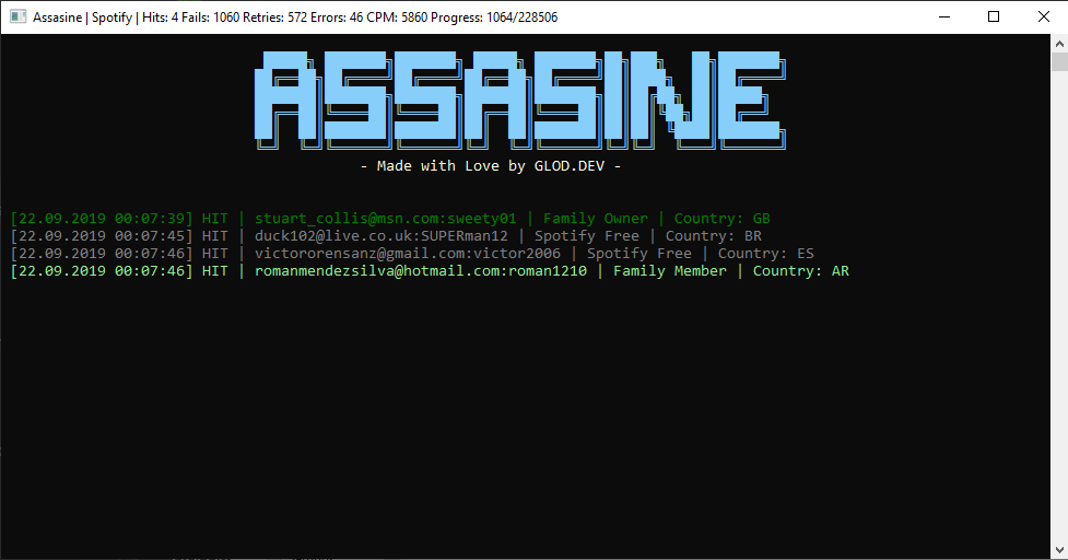 Assasine is a Spotify checker created by gold.dv. I have already uploaded many checkers of Spotify on my website but you should also try this checker. This save each country hits in a separate file. You have to put your combo in “combo.txt” after that start the checker. As this checker is proxyless so you don’t need any proxy to use this checker. If you want quick notification of my updates to make sure you hit the allow button that will pop-up on your screen.