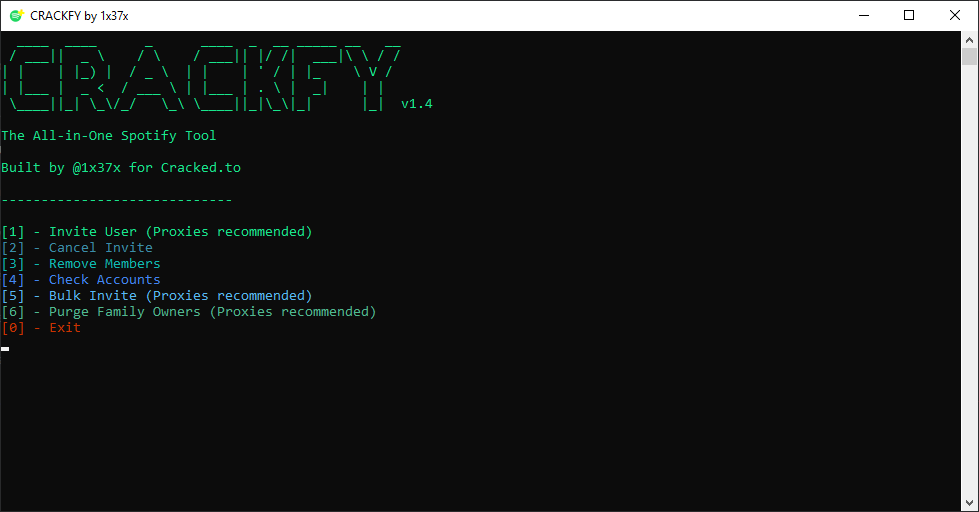 Crackfy all in one Spotify tool. Crackfy is a console app to upgrade Spotify accounts, cancel invites, check for valid subscription and convert combos from email: pass to user: pass and vice versa. All hits get saved in separate files based on subscription. Enter any key to use the tool.