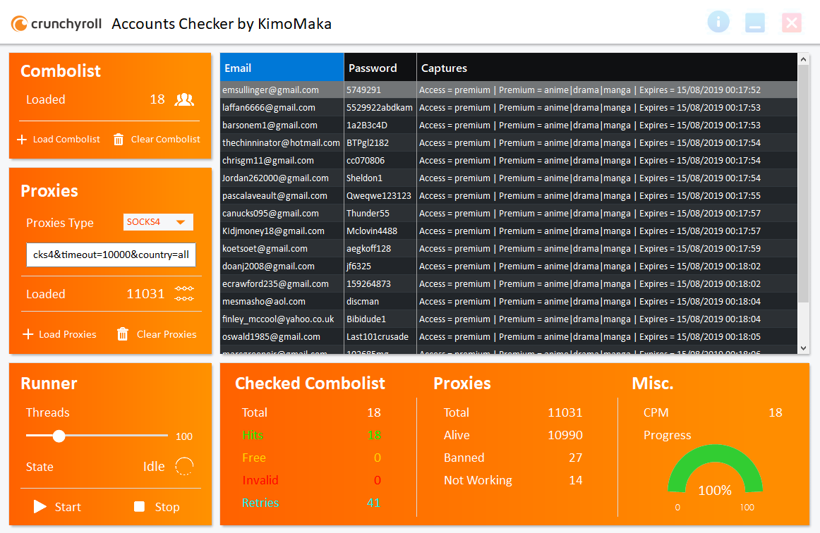 Crunchyroll account checker by KimoMaka. I have already uploaded Crunchyroll account checker by xRisky but here is the latest and brand new Crunchyroll checker. I’m pretty sure you are gonna love this. KimoMaka is another good coder like you can see his interface of the checker. I mean what an Interface he made. The important this about this checker that it also supports API proxy providers. Load your combo & proxies and start the checker. If you want to change proxy type or the number of thread you can do that. At the bottom of the checker, you can see three sections Checked Combolist, Proxies and Misc. Mics section shows CPM and Progress, and I think you are familiar with the other two.
