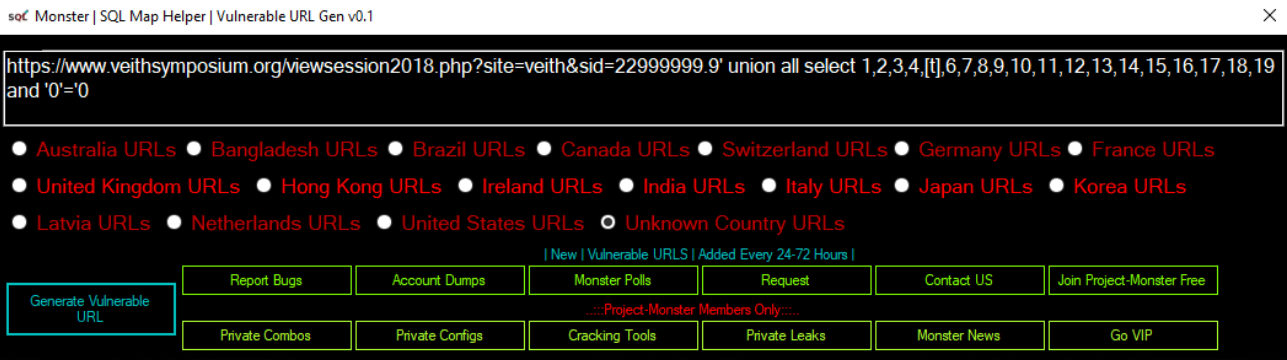 What is SQL Map Helper? Monster SQL Map Helper generates Vulnerable URLs to dump Combos/Data Etc, say you have a hard time finding Vulnerable URLs to Dump? Or ur trying to learn how to use SQLMap or SQLiDumper well this tool will help you generator 100% Vulnerable URLs Every time. Vulnerable URLs updated Every 24-72hours. Basically, this tool will help you to find susceptible URLs so that you can easily inject them using sqli dumper.